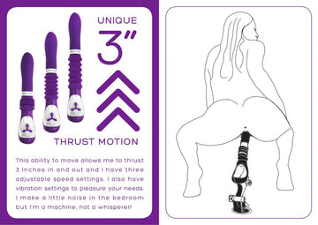 The objective was to create a thrusting machine capable of imitating the power of these bigger machines, yet still be light and portable. It was a challenge to create a thrusting device small enough to carry and store easily, i.e. handbag, suitcase or bedside drawer, but we were up to it and persevered.